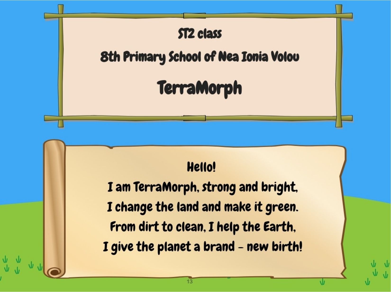 Μέσα στα πλαίσια της διασχολικής αυτής συνεργασίας, οι μαθητές θα μεταμορφώσουν τον χάρτη της χώρας τους σε ένα μυθικό Πλάσμα-Φύλακα που θα προστατεύει το περιβάλλον και θα αντιμετωπίζει σύγχρονες οικολογικές απειλές. Κάθε σχολείο θα δημιουργήσει μια μασκότ και μια σχετική ιστορία, προτείνοντας λύσεις σε πραγματικά περιβαλλοντικά προβλήματα. Όλες οι δημιουργίες θα συγκεντρωθούν σε ένα ψηφιακό εικονογραφημένο βιβλίο και σε μια κοινή VR έκθεση. Η αγγλική θα είναι η γλώσσα εργασίας, ενώ μέσω της μεθόδου CLIL οι μαθητές θα συνδυάσουν τη γλωσσική μάθηση με περιβαλλοντική εκπαίδευση, μυθολογία και ψηφιακές δεξιότητες.