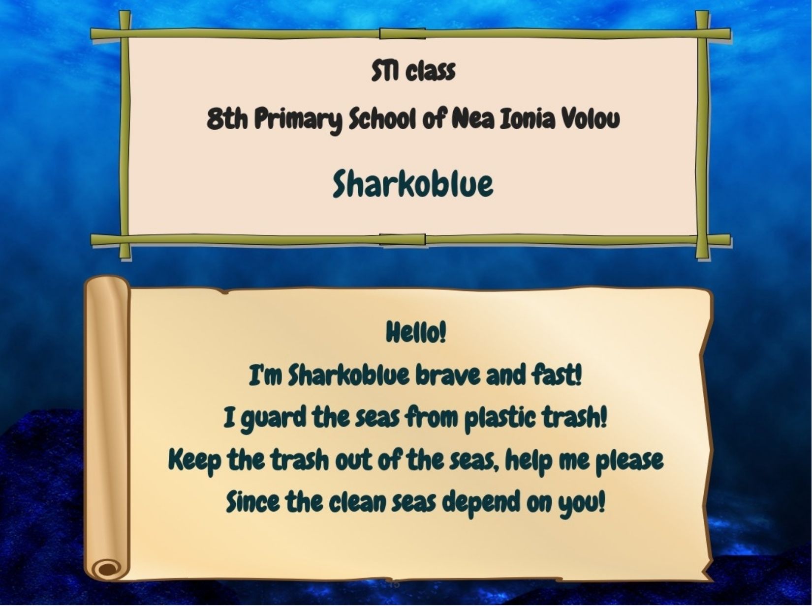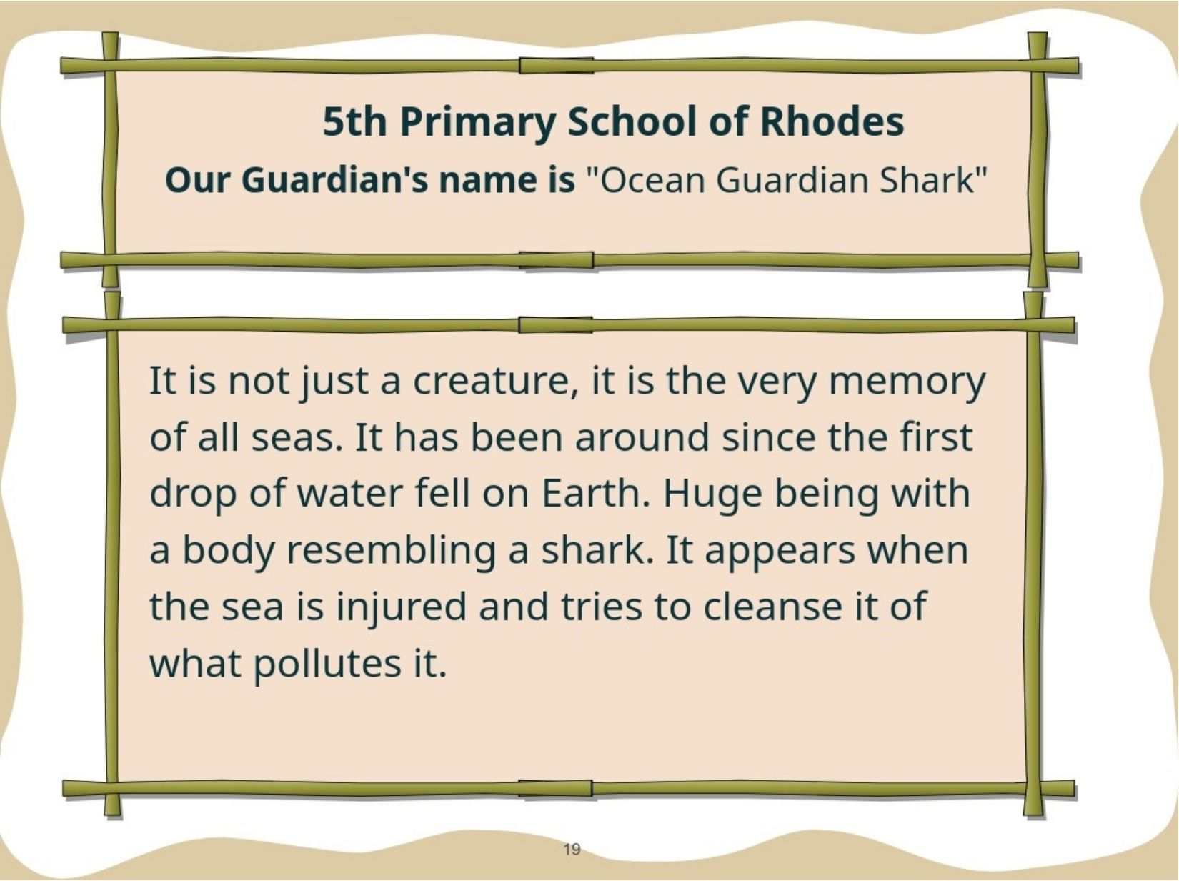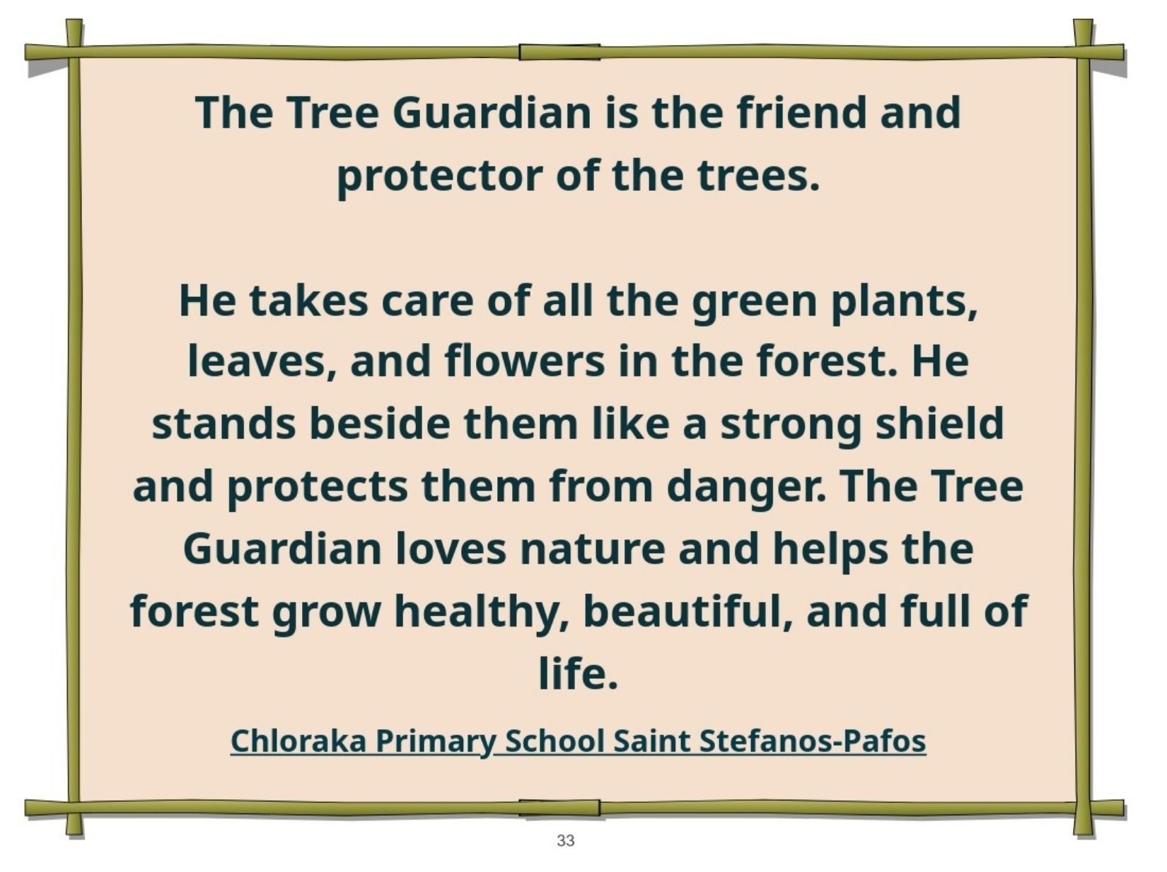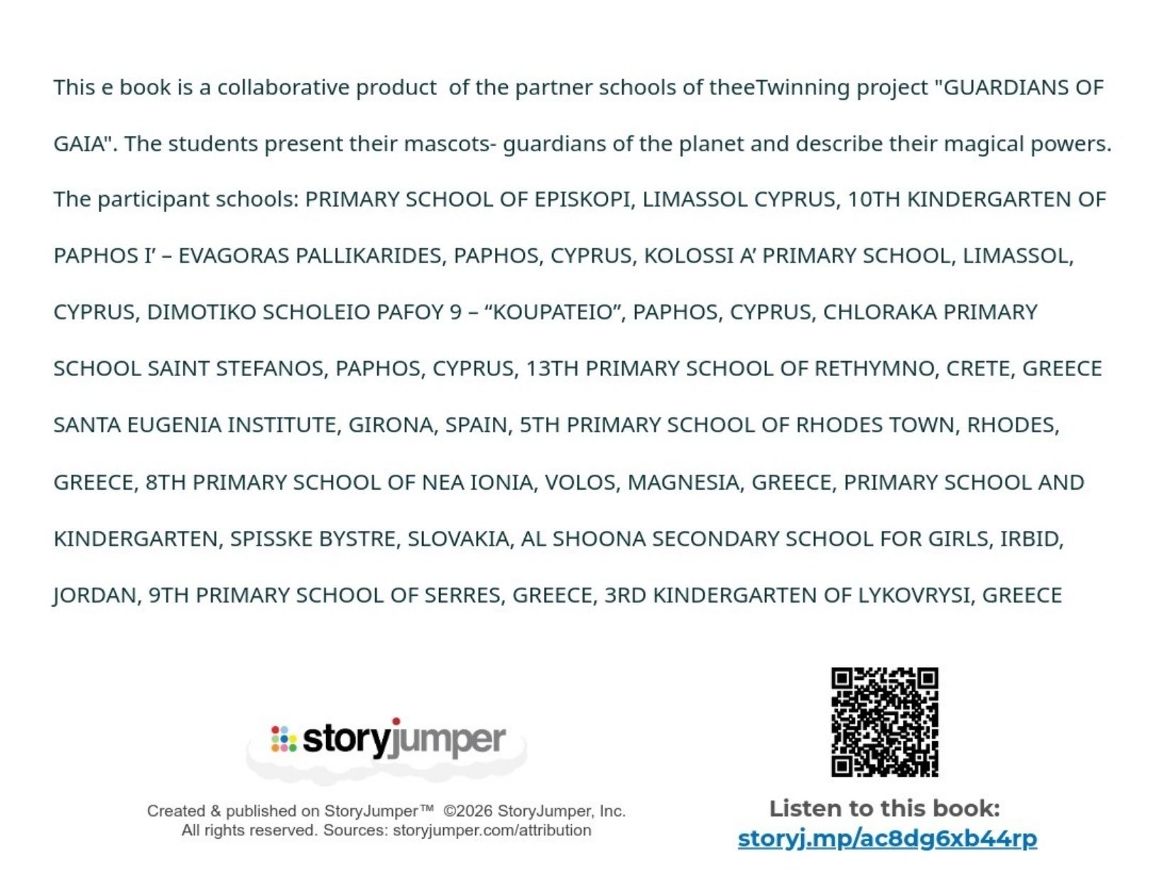 Παρουσιάζουμε το εικονογραφημένο ψηφιακό μας βιβλίο στο οποίο οι μαθητές του κάθε σχολείου θα παρουσιάσουν ένα μυθικό Πλάσμα - Φύλακα. Συγκεκριμένα, θα μεταμορφώσουν τον χάρτη της χώρας τους σε ένα μυθικό Πλάσμα-Φύλακα που θα προστατεύει το περιβάλλον και θα αντιμετωπίζει σύγχρονες οικολογικές απειλές.