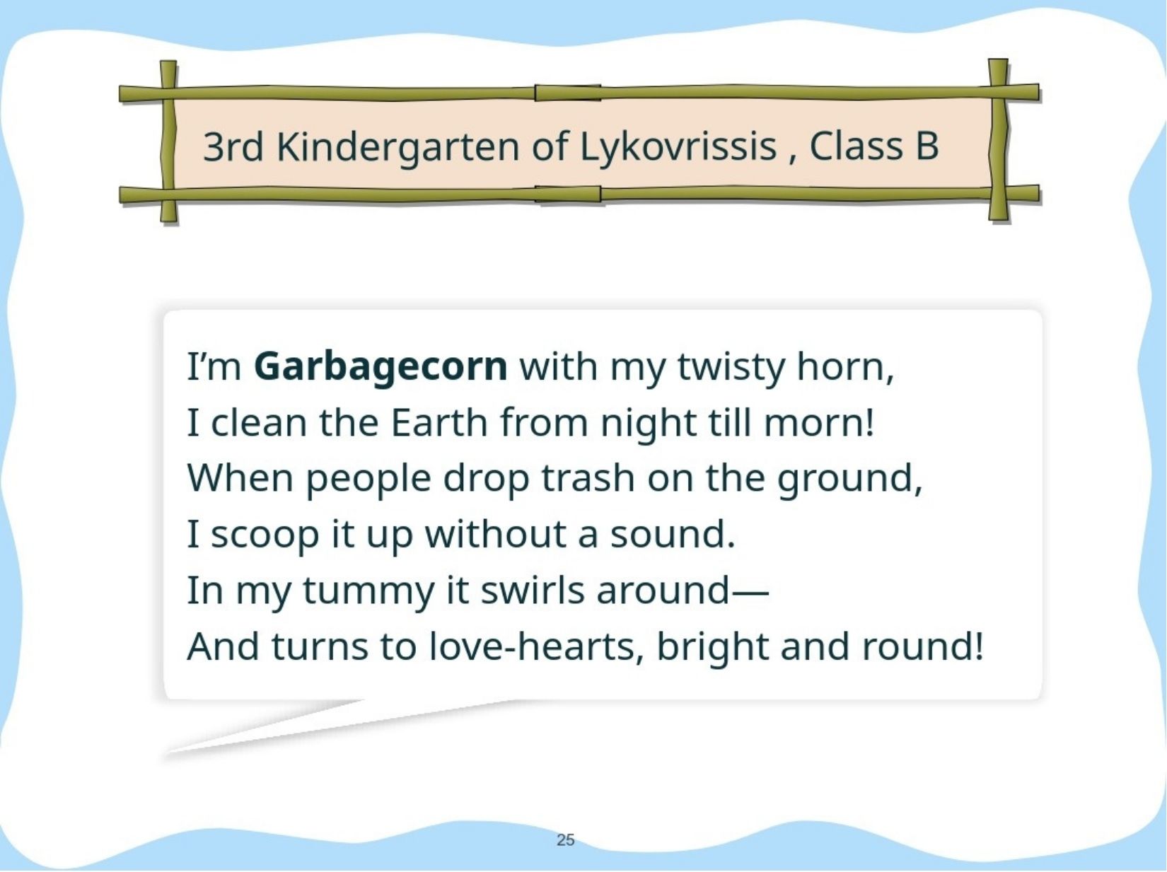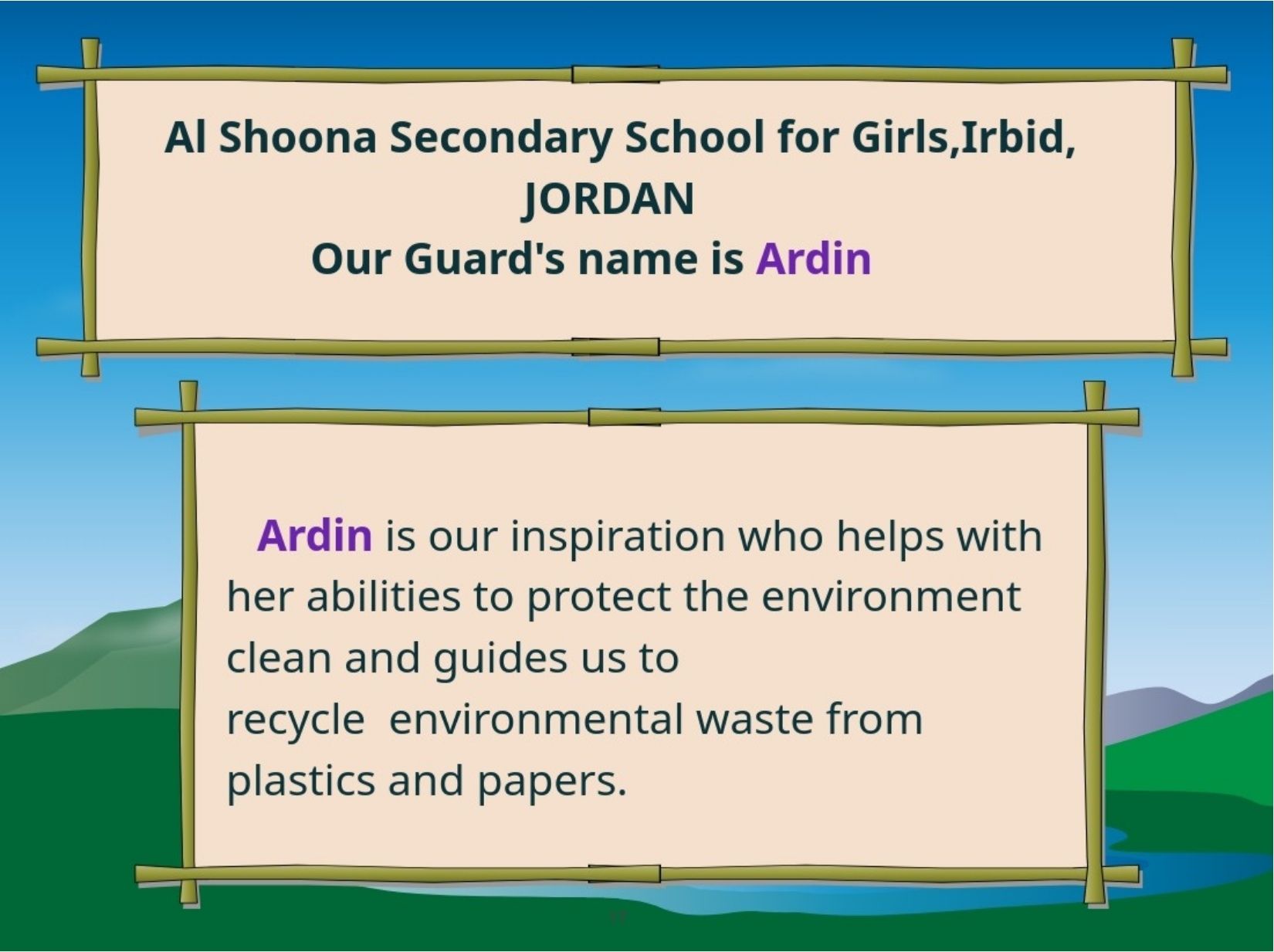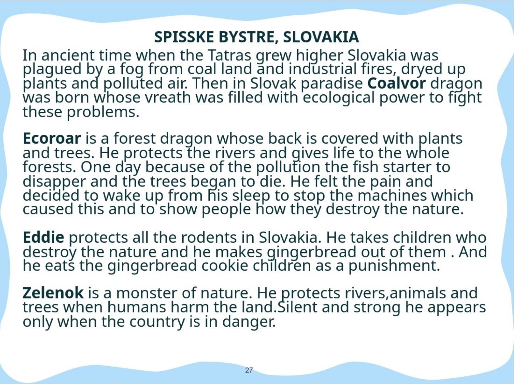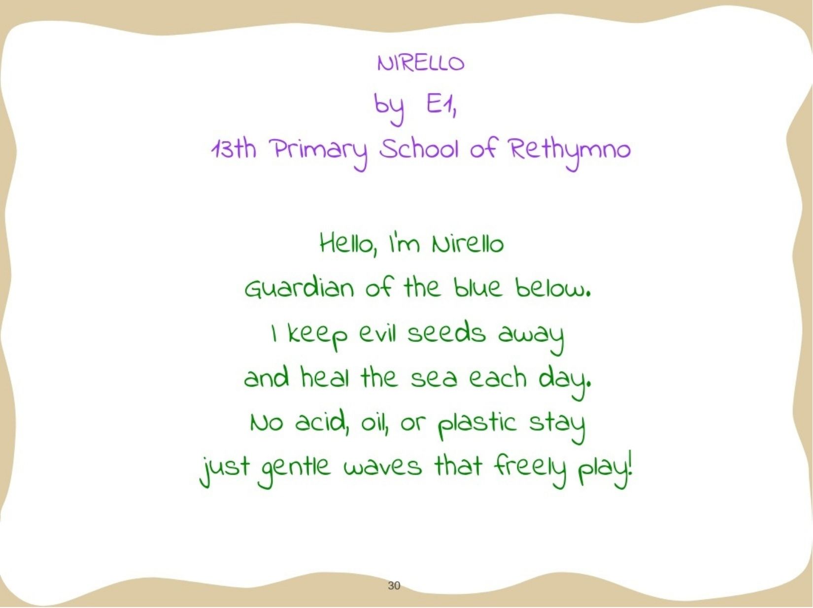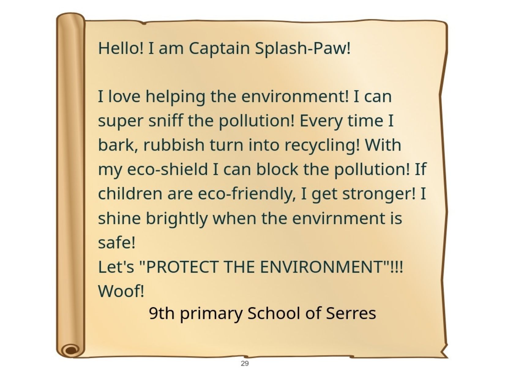 Παρουσιάζουμε το εικονογραφημένο ψηφιακό μας βιβλίο στο οποίο οι μαθητές του κάθε σχολείου θα παρουσιάσουν ένα μυθικό Πλάσμα - Φύλακα. Συγκεκριμένα, θα μεταμορφώσουν τον χάρτη της χώρας τους σε ένα μυθικό Πλάσμα-Φύλακα που θα προστατεύει το περιβάλλον και θα αντιμετωπίζει σύγχρονες οικολογικές απειλές.