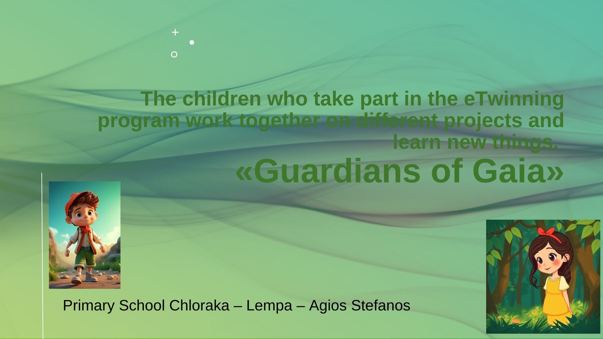 Ο τίτλος της διασχολικής συνεργασίας στην οποία συμμετέχει το σχολείο μας, στα πλαίσια του προγράμματος eTwinning, είναι “GUARDIANS OF GAIA” (Φύλακες της Γης) και αφορά σε οικολογικά ζητήματα. Οι μαθητές μας θα συνεργαστούν με σχολεία από Κύπρο, Ελλάδα, Ισπανία και Σλοβακία.