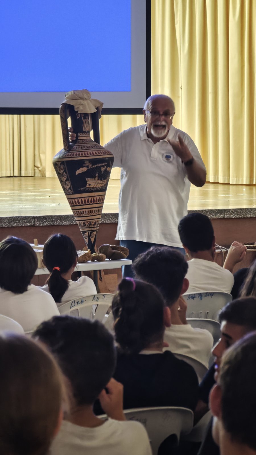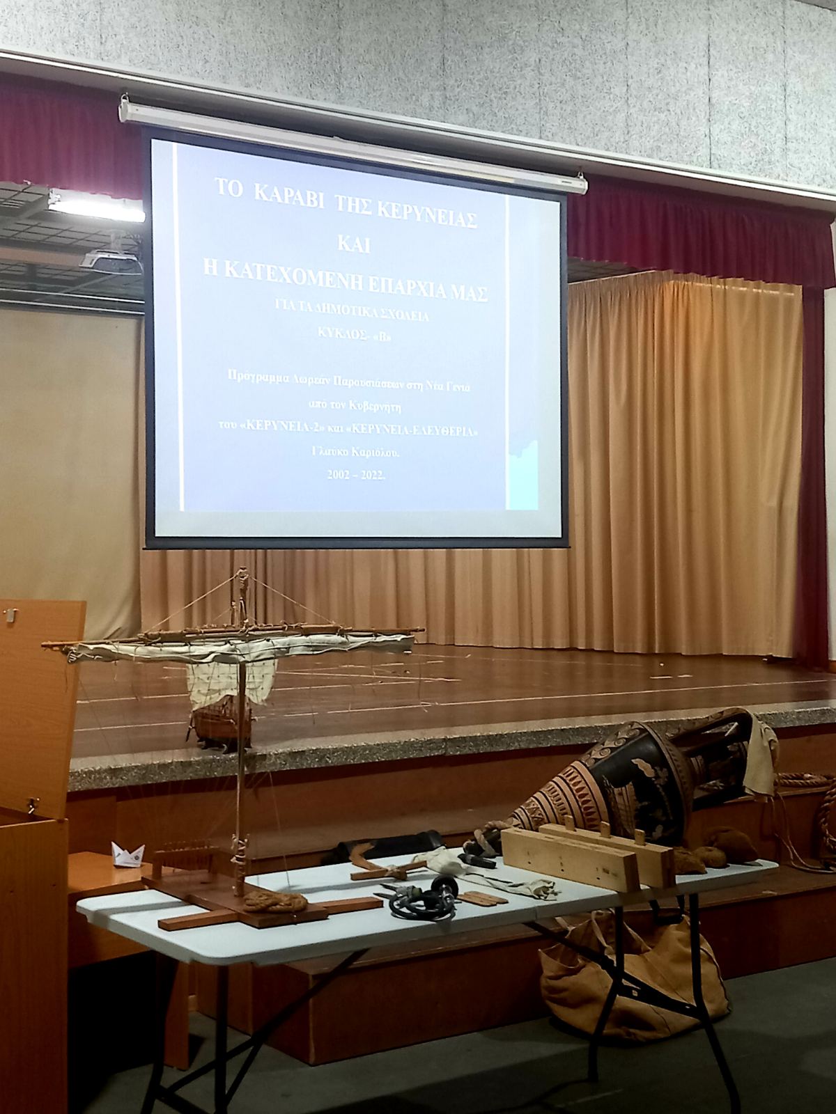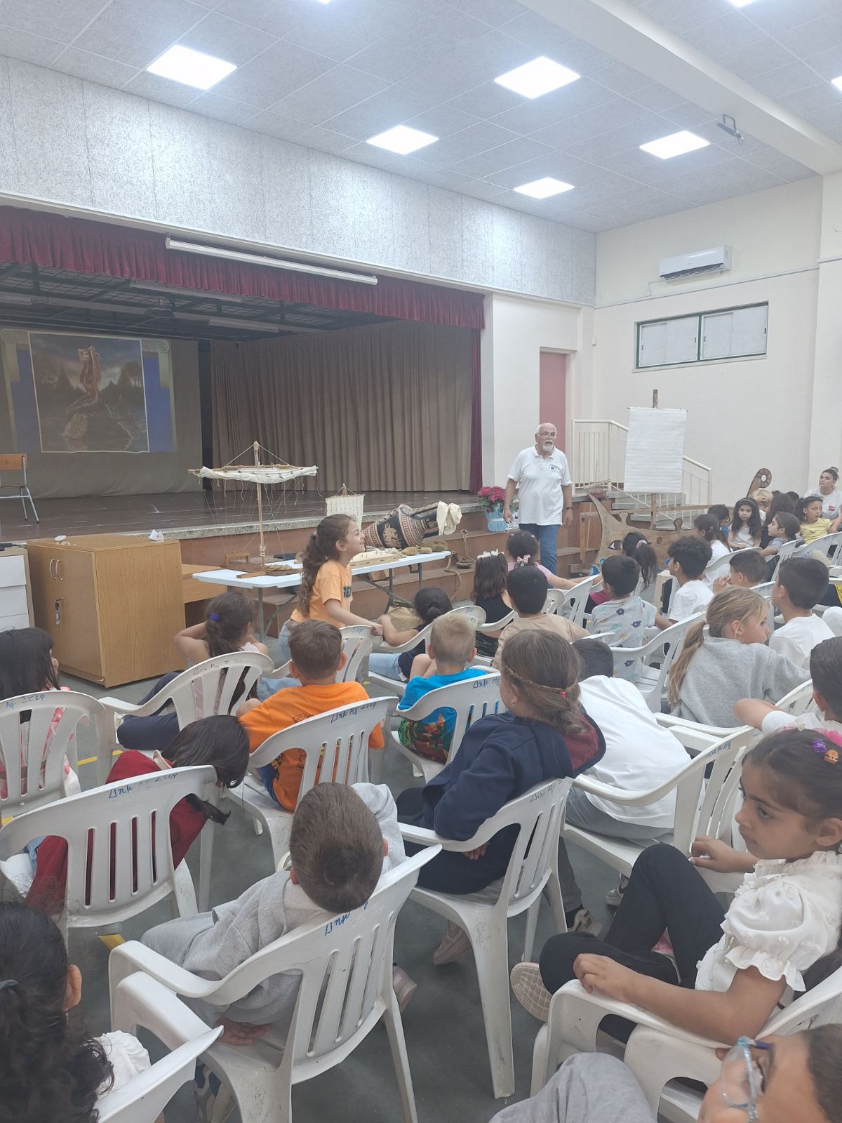 12.5.25. Σήμερα με ιδιαίτερη συγκίνηση υποδεχθήκαμε στο σχολείο μας, στα πλαίσια διασχολικής συνεργασίας με το Δημοτικό Σχολείο Χλώρακα (Αγίου Νικολάου) τον κ. Γλαύκο Καριόλου. Με σεβασμό και συγκίνηση, μοιράστηκε μαζί μας την ιστορία του καραβιού της Κερύνειας — ενός ζωντανού μνημείου του πολιτισμού μας και της καταγωγής μας, που ανασύρθηκε από τα βάθη της θάλασσας και της ιστορίας. Μέσα από την εμπνευσμένη παρουσίασή του, ζωντάνεψε η κατάδυση του πατέρα του, Ανδρέα Καριόλου, εκείνο το πρωινό της 20ης Νοεμβρίου του 1965 όπου ακολουθώντας το σύννεφο λάσπης που άφηνε πίσω η άγκυρα του σπογγαλευτικού του σκάφους, έμεινε έκθαμβος μπροστά από ένα αναπάντεχο θέαμα: Το αρχαίο ναυάγιο. Μαζί με τον κ. Γλαύκο Καριόλου και το πολύτιμο υλικό που μοιράστηκε μαζί μας, μικροί και μεγάλοι, ταξιδέψαμε νοερά στα νερά της αρχαίας Μεσογείου και νιώσαμε πιο κοντά από ποτέ τον παλμό της πολιτιστικής μας κληρονομιάς και της κατεχόμενης μας πατρίδας. Η μέρα κορυφώθηκε με τα αποκαλυπτήρια ενός συγκινητικού έργου τέχνης που δημιούργησαν με αγάπη οι μαθητές της Στ' τάξης με την καθοδήγηση της εκπαιδευτικού του σχολείου μας κας Ιουλίας Παναγιώτου Αχεριώτη, αφιερωμένου στην Κερύνεια – ως σύμβολο ελπίδας, μνήμης και προσμονής για επιστροφή.