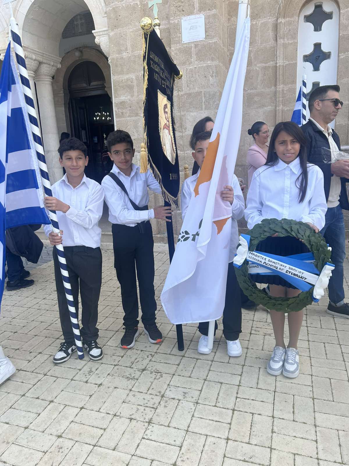 Στις 6.4.25 άγημα μαθητών αντιπροσώπευσε το σχολείο μας στο ετήσιο Μνημόσυνο Ηρώων ΕΟΚΑ 55-59 της κοινότητας Χλώρακας. Οι μαθητές τίμησαν με την παρουσία τους, τους ηρωες, απάγγειλαν ποιήματα και επίσης έγινε κατάθεση στεφάνων εκ μέρους του σχολείου.