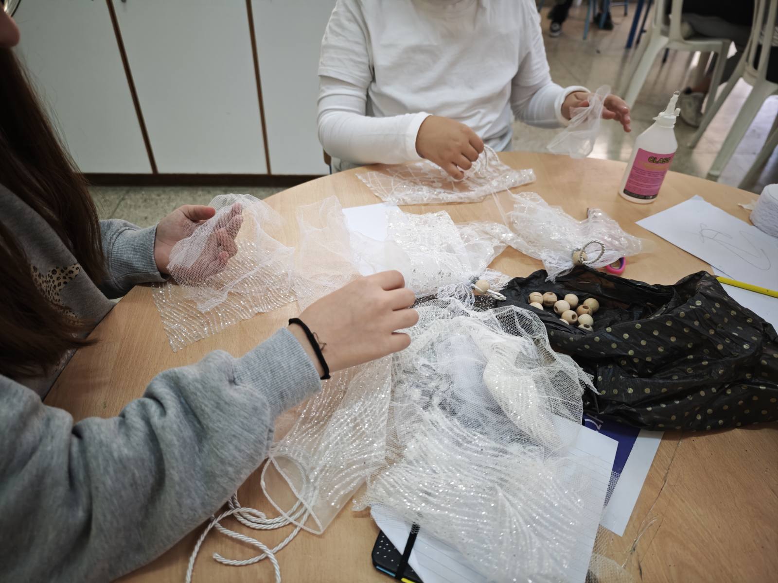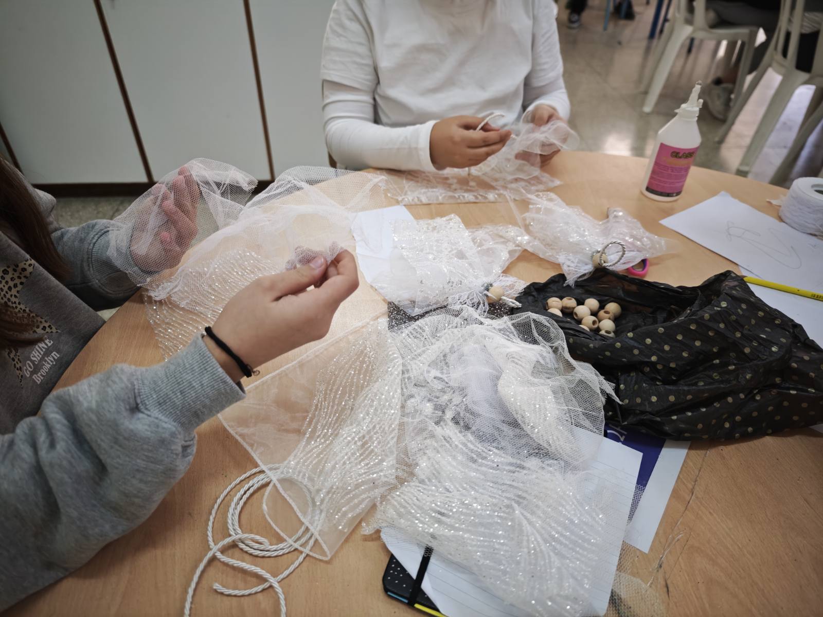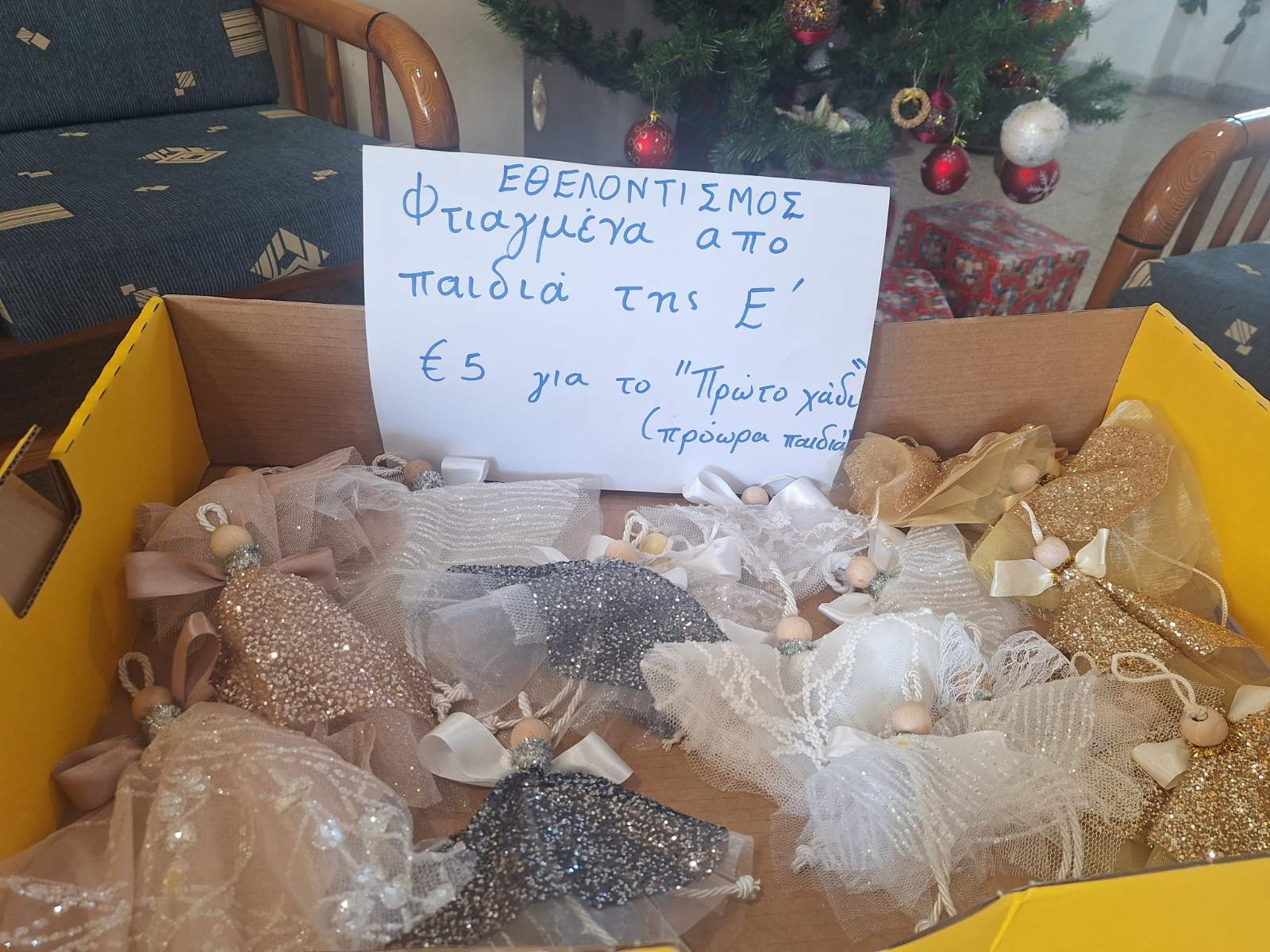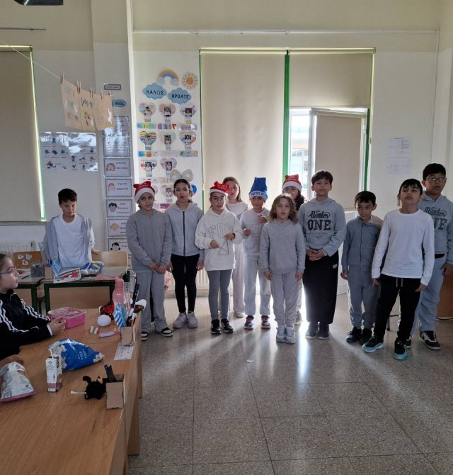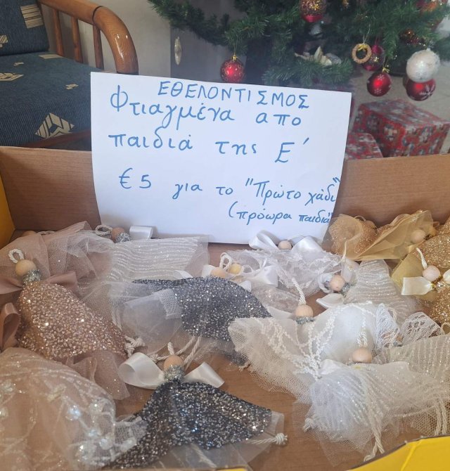 Στα πλαίσια της εθελοντικής προσφοράς, μαθητές της Ε' τάξης με την καθοδήγησης της ΒΔ Ιουλίας Παναγιώτου Αχεριώτη κατασκεύασαν χριστουγεννιάτικα στολίδια αγγελάκια με ανακυκλώσιμα υλικά. Τα καθαρά έσοδα της δράσης θα διατεθούν στον Σύνδεσμο "Πρώτο Χάδι" για τα πρόωρα μωρά.